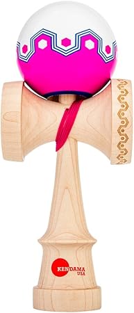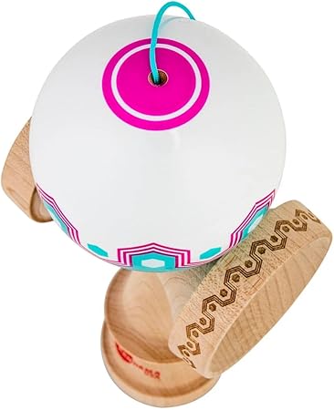 ピンクとホワイトのタマを、中央に施されたブルーの幾何学模様が引き締めるスタイリッシュなデザイン。 ベベルリング、トップスポッター、ビッグカップ縁の刻印が、視認性(トラッキング)を高め、見た目だけでなく、プレイのしやすさも抜群です。 表面は最新のシルクペイントでコーティングされ、チェリー材のタマとメイプル製のルナシェイプケンを組み合わせ。ケンとタマは7g以内で重量バランスをしっかり調整済み。 オリジナルデザインのOrigamiバッグも付属しています。
